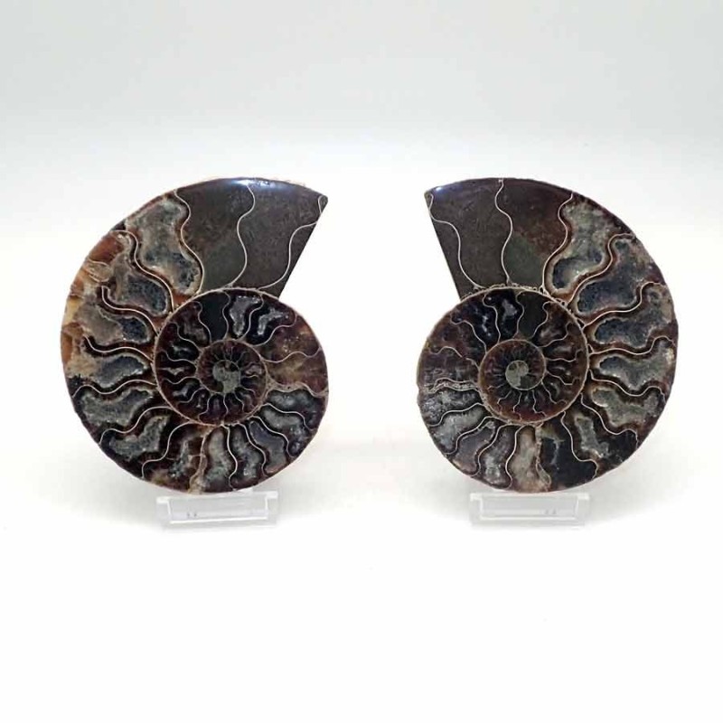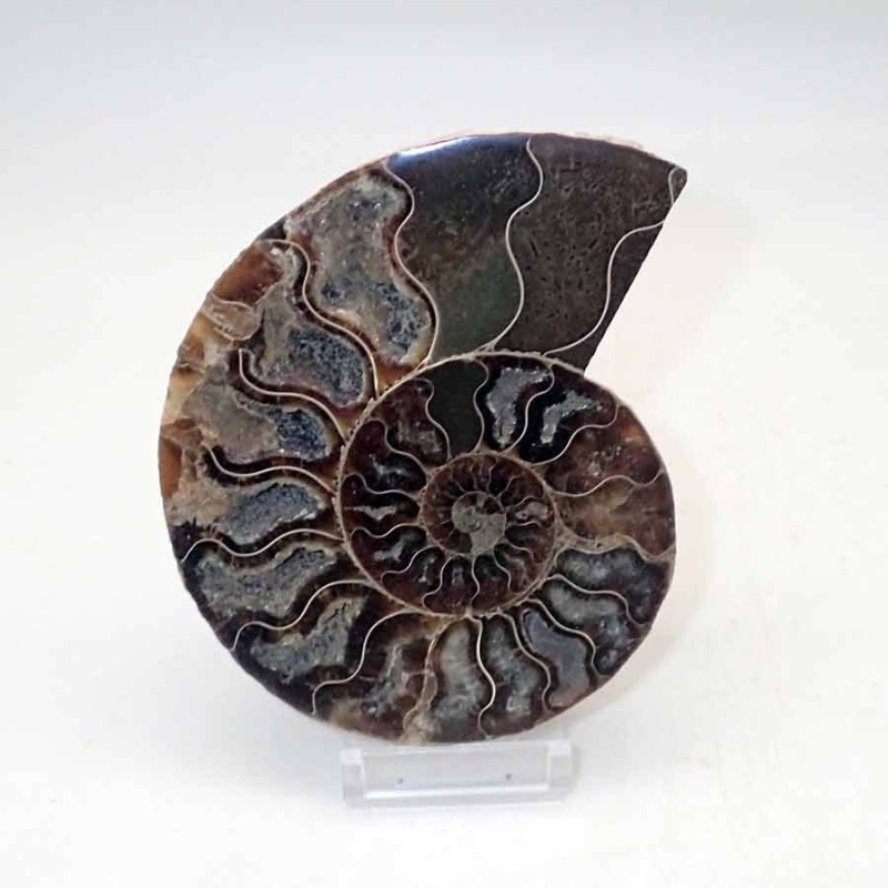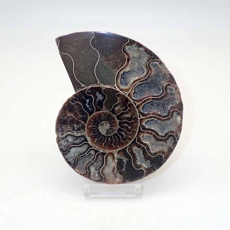 Ammonite measuring ±11 x 9 cm, sectioned in half. All the mineralized chambers are visible, with contributions from various minerals.