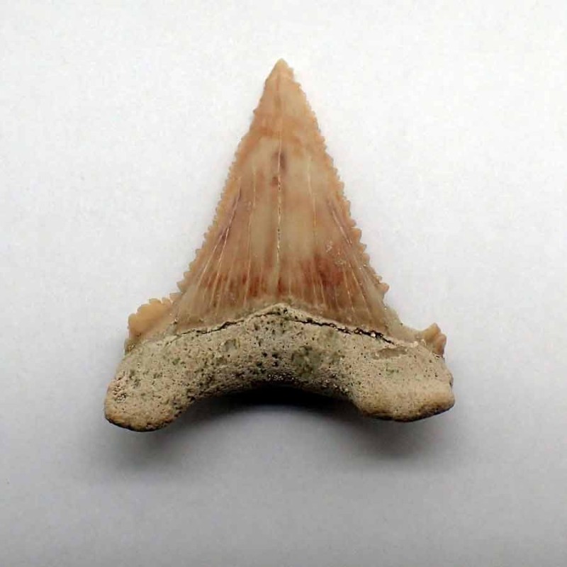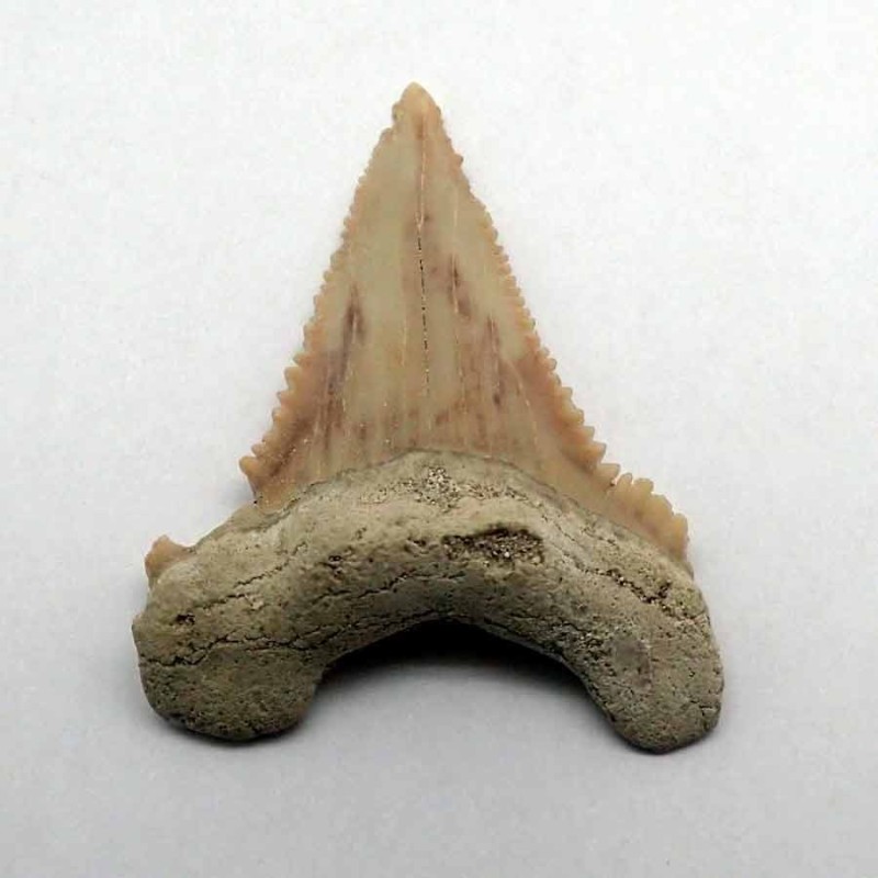 Upper front tooth measuring ±4.3 × 3.4 cm, exceptional in size and preservation, with a very pronounced serration. Comes with box and description.