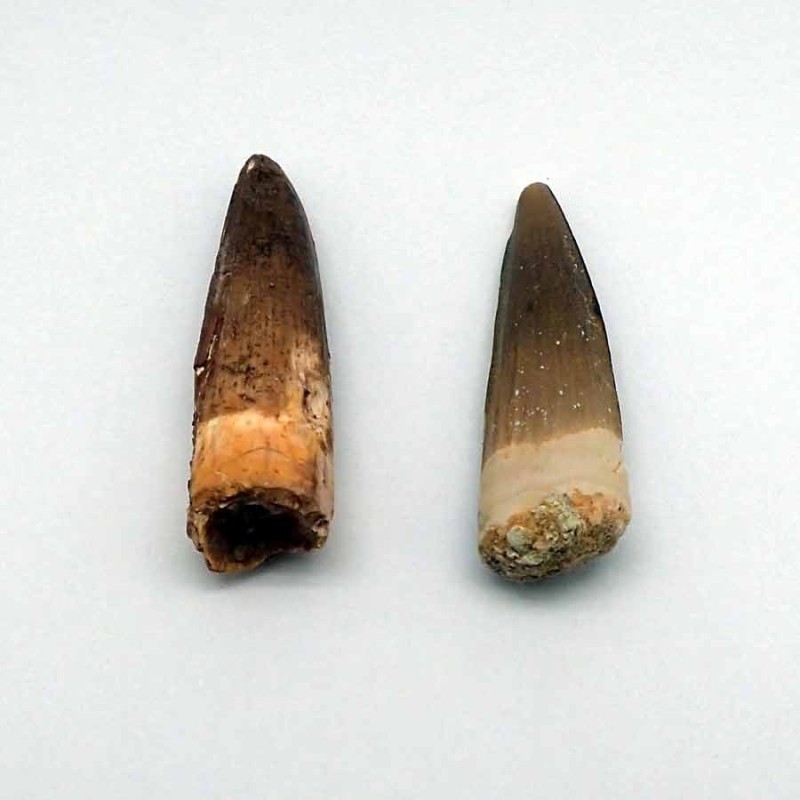 Front tooth measuring approximately 3.3 cm (left) and lateral tooth measuring approximately 3.1 cm (right), both belonging to a young specimen. The tips show minimal wear and the roots are mostly intact. Comes with a display case.