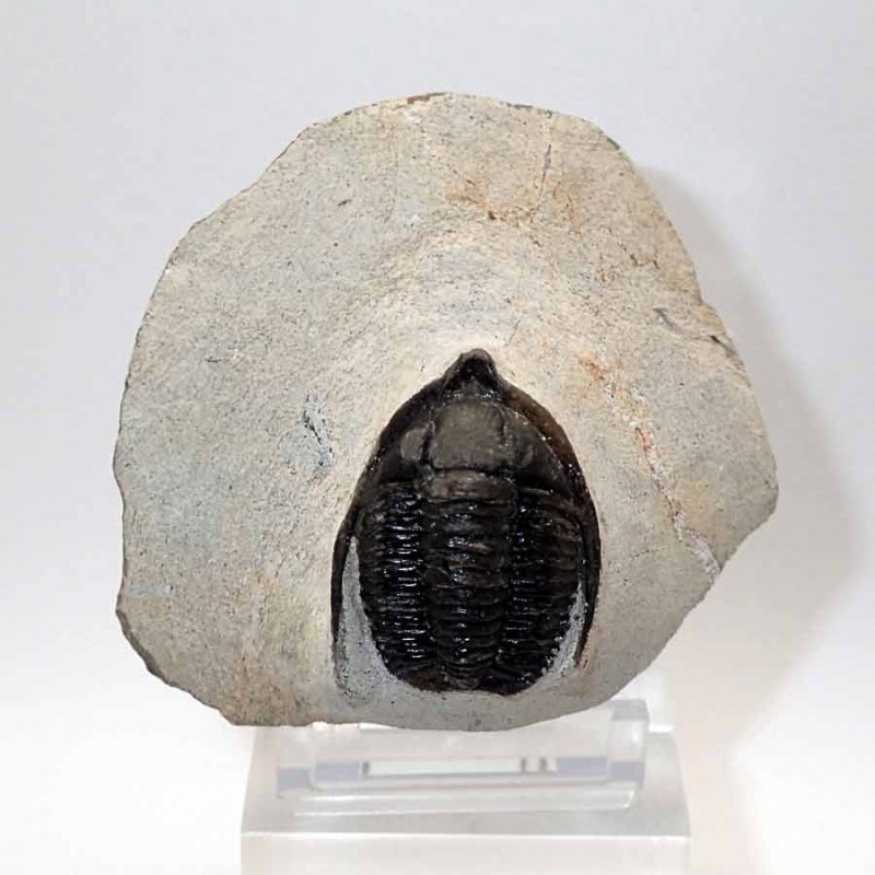 The specimen measures approximately 7.2 x 6.7 cm, with the trilobite itself measuring approximately 3.5 cm. It has not been altered or painted. The rock is fractured, but this does not affect the trilobite. It has been cleaned using sandblasting, revealing even the smallest details.