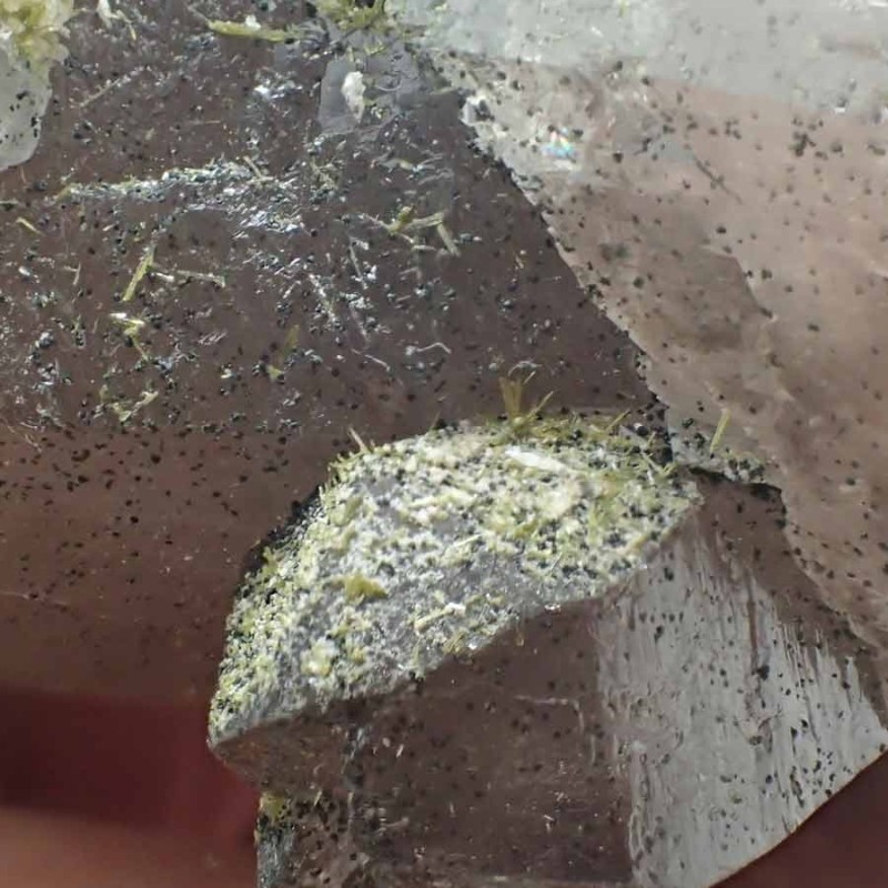 Ejemplar con cristales terminados y bien definidos de cuarzo ahumado de ± 14.5 x 8 cm, naturales y brillantes. Sobre el cuarzo a crecido unos cristales de Epidota verdes.