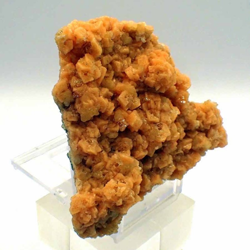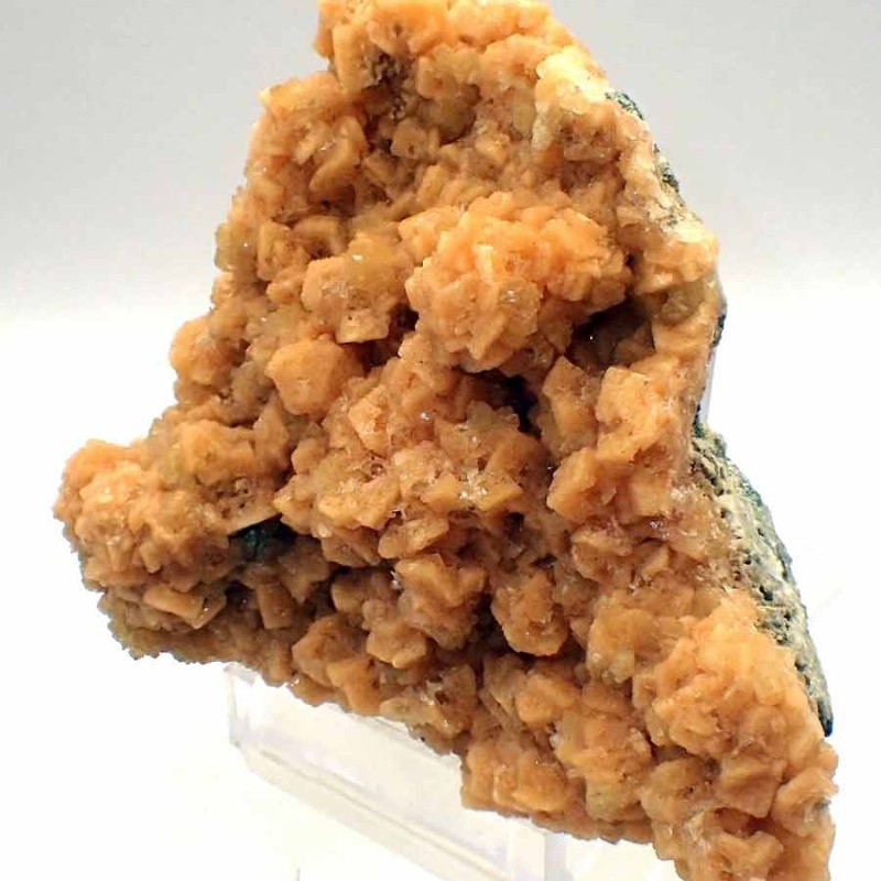 Ejemplar de ± 8.5 X 7.5cm con cristales de Chabasita, en matriz, con apariencia cúbica, buen brillo y muy anaranjados. La Estellerita se presenta en forma de crecimientos globulares
