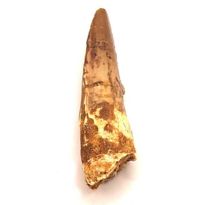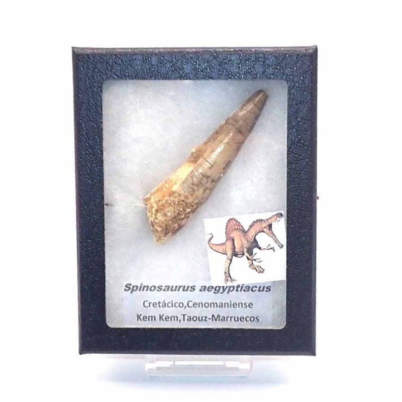 Diente frontal de Spinosaurus de ± 6.7 cm con raíz. Pertenece a un individuo adulto, la punta está usada. Se entrega con caja y descripción.