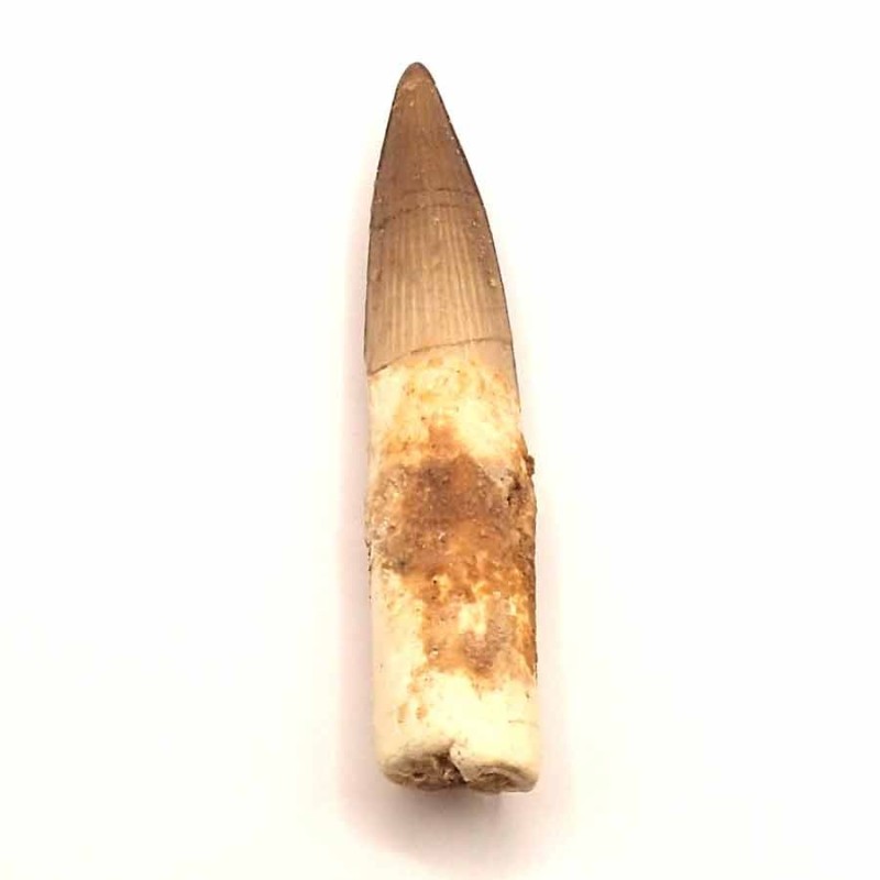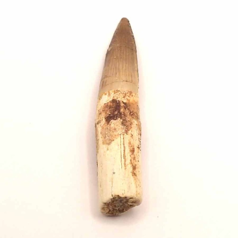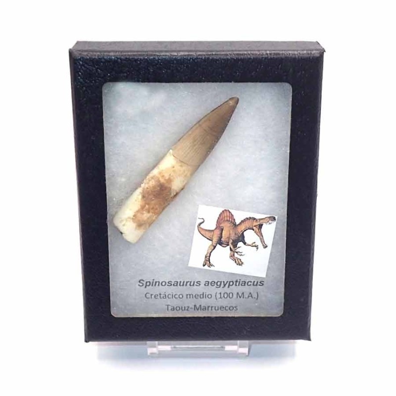 Diente frontal de Spinosaurus de ± 6.5 cm con raíz completa. Pertenece a un individuo joven, la punta está usada. Se entrega con caja y descripción.