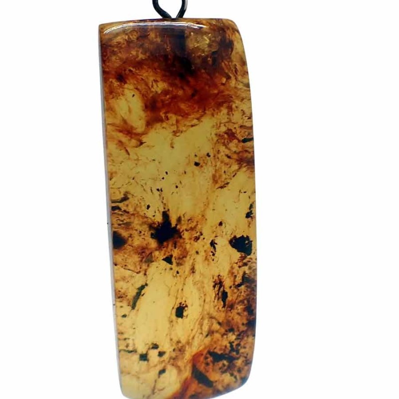 Colgante de ámbar de México, pesa 8.84 gramos y mide ± 4.7 x 1.6 cm. La característica de este ámbar es que es fluorescente y contiene restos de vegetales fósiles.